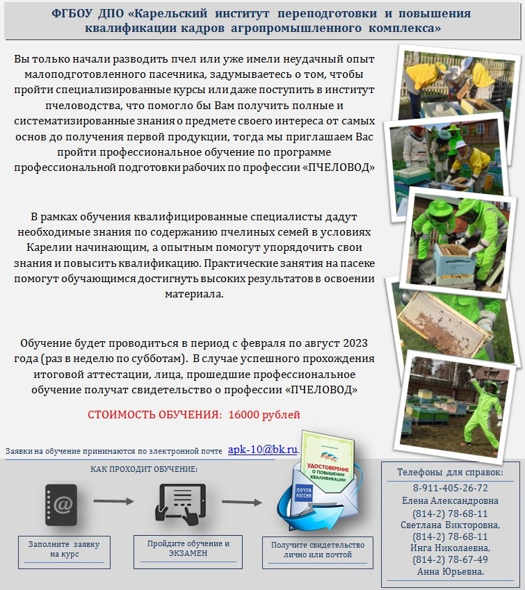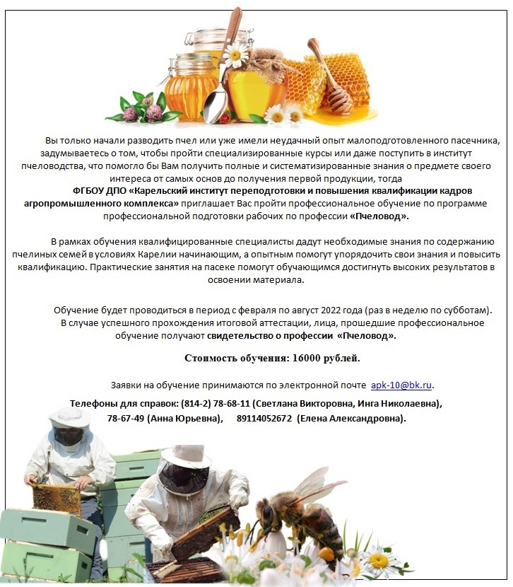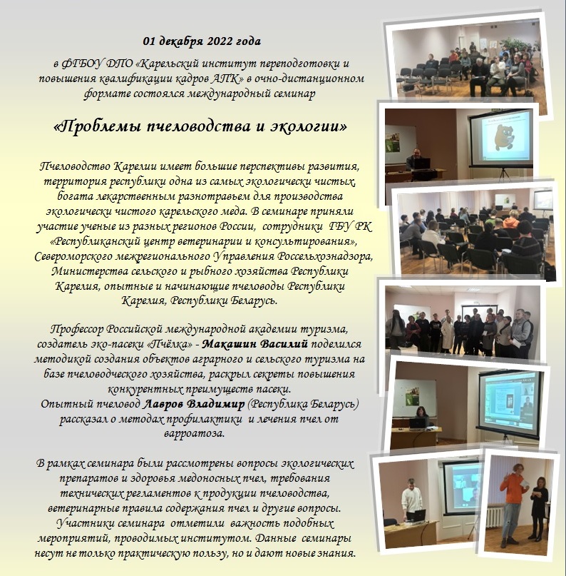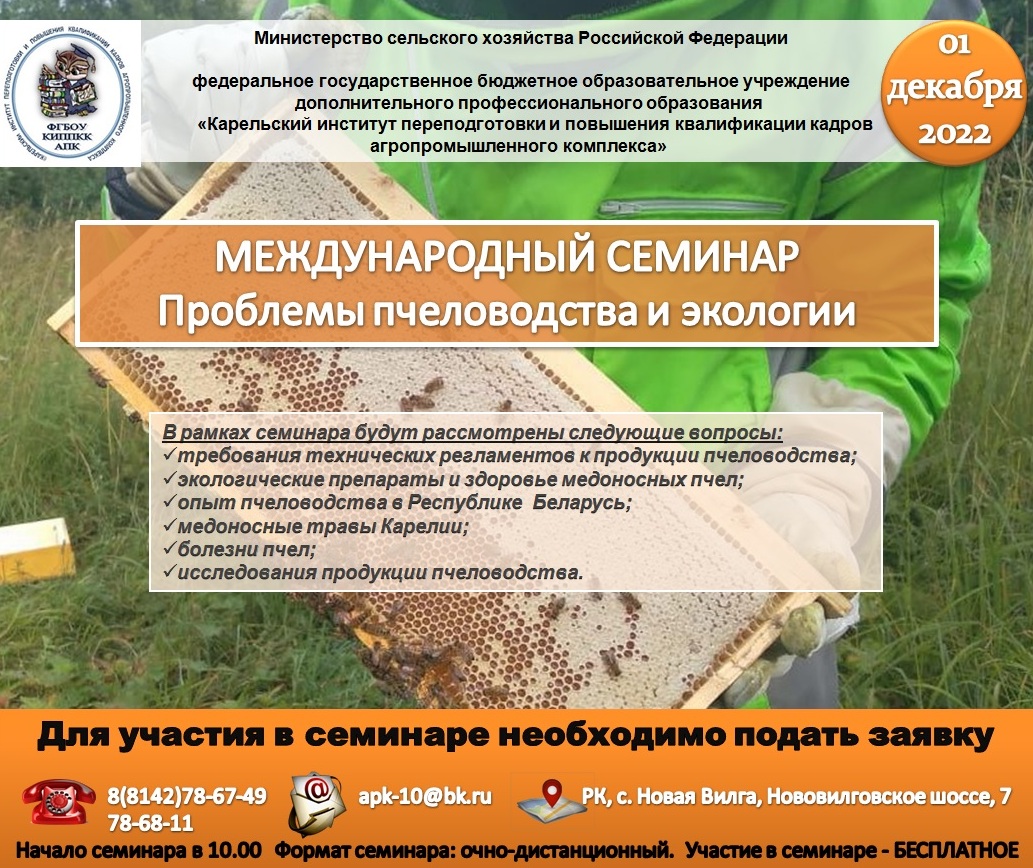 ФГБОУ ДПО «Карельский институт переподготовки и повышения квалификации кадров АПК» совместно с Министерством сельского и рыбного хозяйства Республики Карелия 25 ноября 2020 года приглашает Вас принять участие в семинаре по пчеловодству «Теоретические и практические аспекты пчеловодства в Республике Карелия».