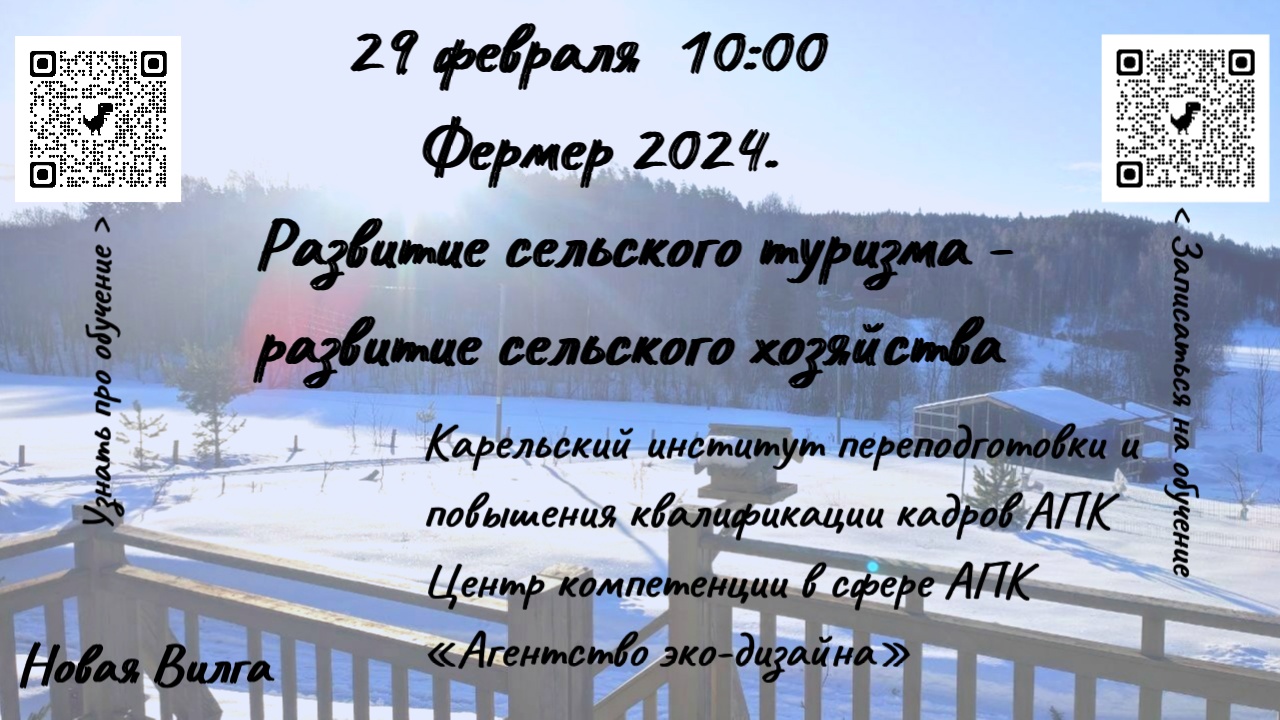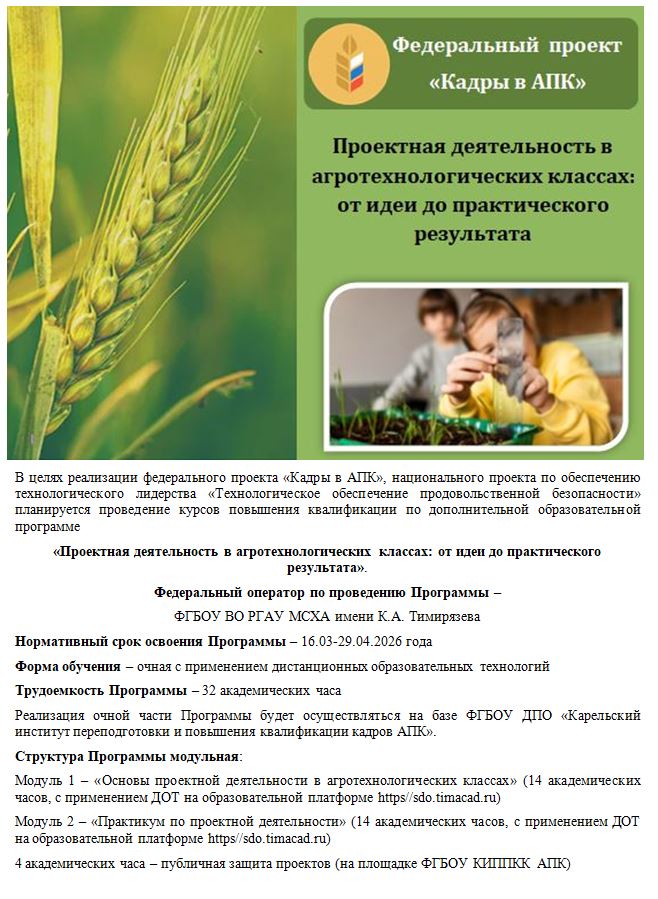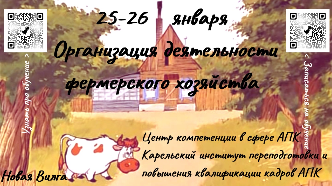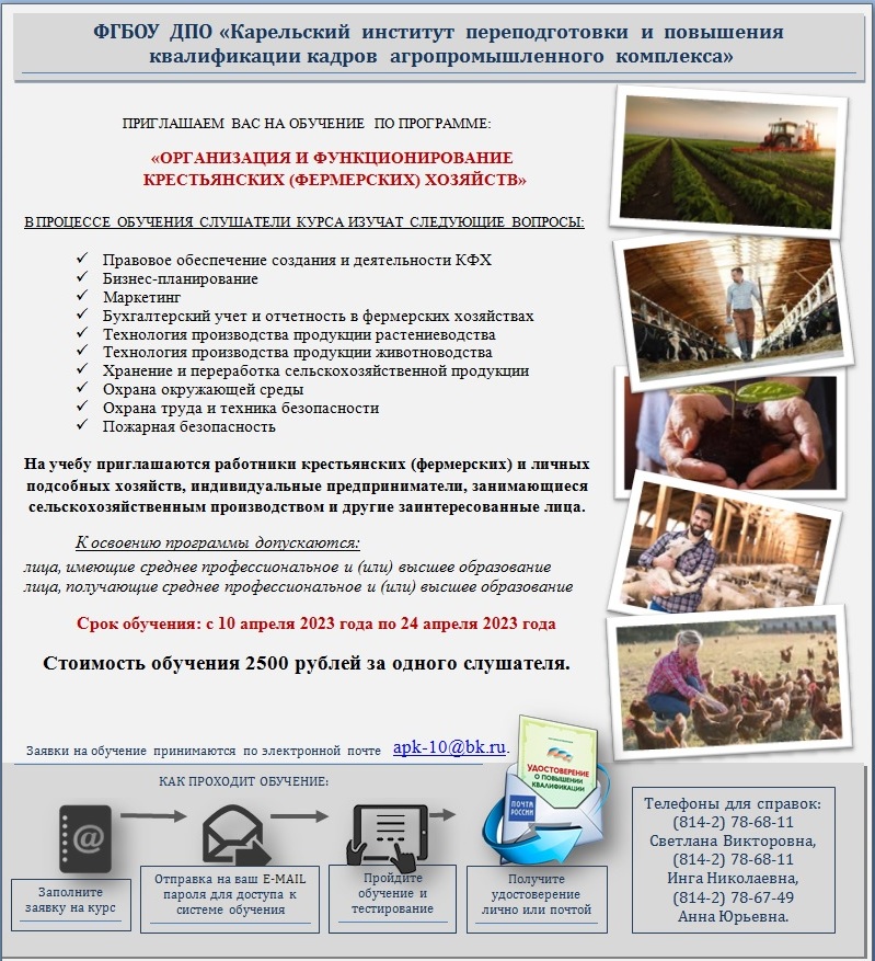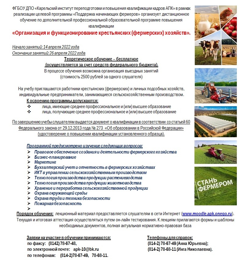 ФГБОУ ДПО «Карельский институт переподготовки и повышения квалификации кадров АПК» в рамках реализации целевой программы «Поддержка начинающих фермеров» организует очно-дистанционное обучение по дополнительной профессиональной образовательной программе повышения квалификации «Организация и функционирование крестьянских (фермерских) хозяйств».