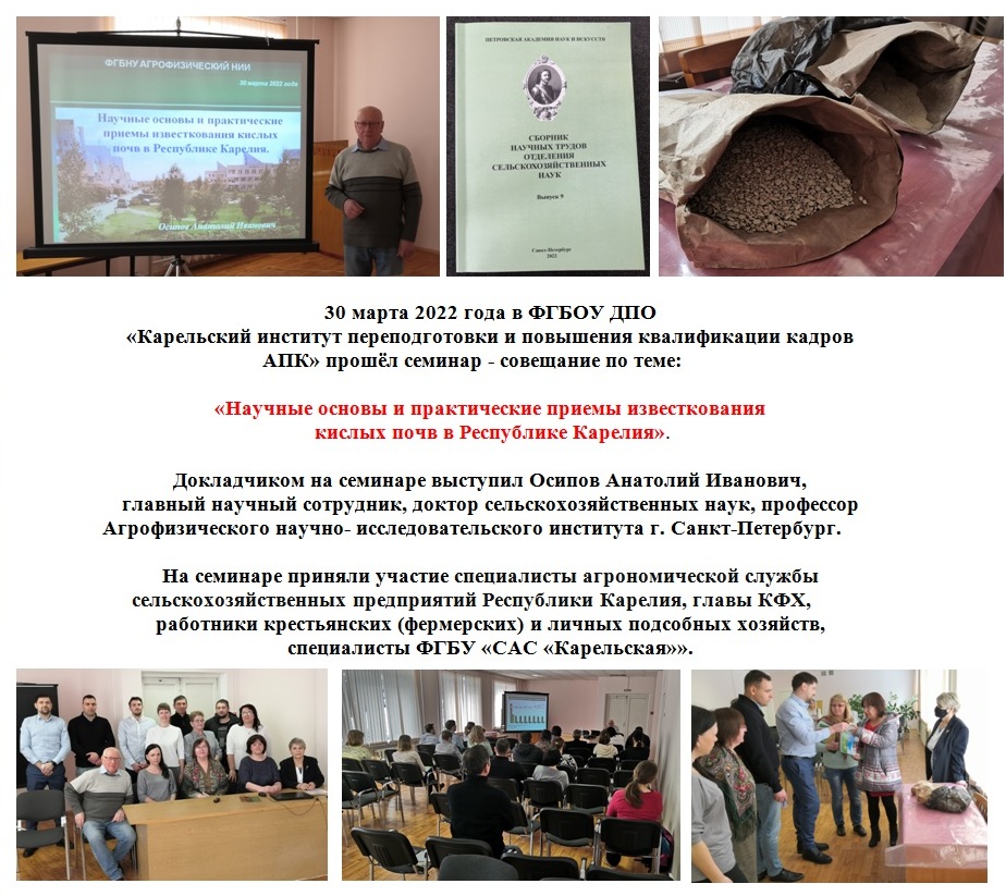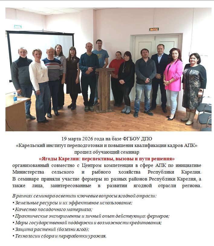 12 марта 2020 года в рамках Государственной программы Российской Федерации на базе ФГБОУ ДПО «Карельский институт переподготовки и повышения квалификации кадров агропромышленного комплекса» состоялся семинар по программе: «Развитие сельских территорий Карелии».